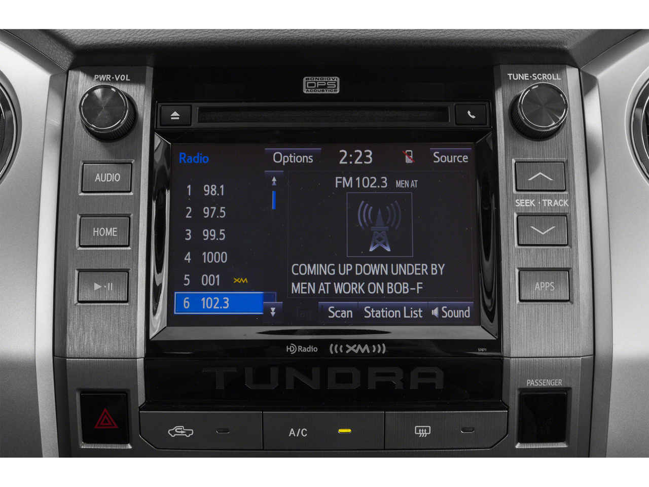 • Radio: Entune Audio Plus -inc: AM/FM/HD radio, CD player MP3/WMA playback capability, navigation, high-resolution 7" touch-screen display, auxiliary audio jack, USB 2.0 port, iPod connectivity and control, iTunes Tagging, traffic and weather, Bluetooth® hands-free phone capability, phone book access, voice recognition and music streaming, SIRIUSXM Satellite Radio, 90-day free trial